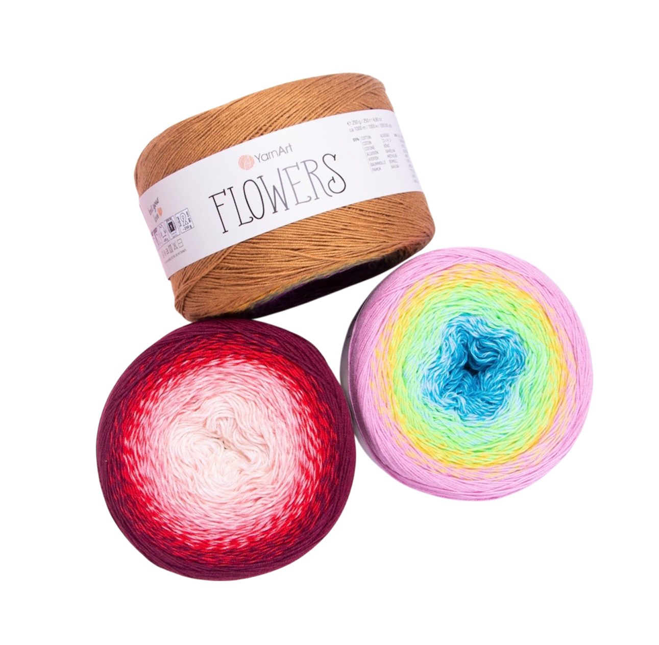Flowers ist ein hochwertiges Farbverlaufsgarn aus 55 % Baumwolle und 45 % Polyacryl.